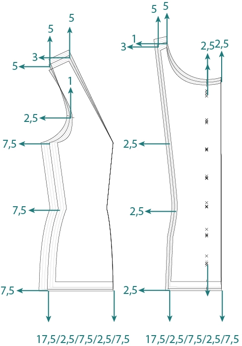 L’ensemble de ces évolutions va permettre de tracer des vecteurs à partir de points de gradation repérés sur le patron de base (les mêmes vecteurs que ceux de votre programme de 5ème au collège). Vous n’aurez plus qu’à reporter les mesures voulues et relier les points entre-deux pour obtenir les autres.