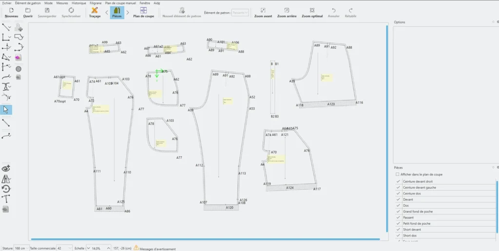 Une fois le tracé validé, nous passons en mode « Pièces ». C’est ici que le dessin géométrique devient un patron de couture prêt à l’emploi.